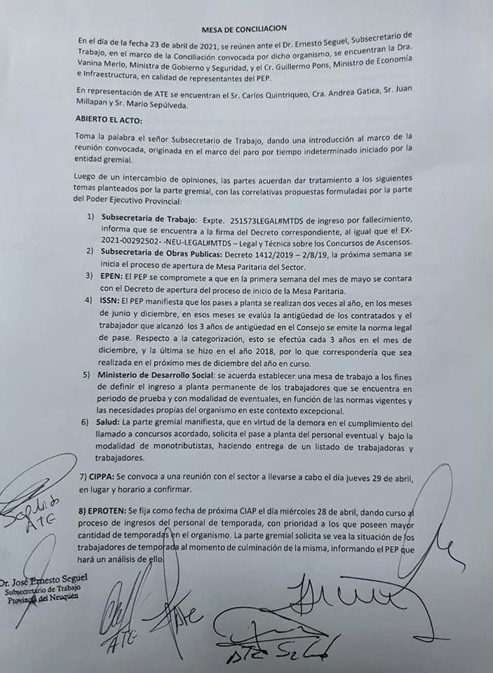 En representación del Ejecutivo neuquino integraron la mesa de negociación la ministra de Gobierno y Seguridad, Vanina Merlo; el titular de Economía, Guillermo Pons; y el subsecretario de Trabajo, Ernesto Seguel. Por el lado del gremio, se hizo presente su titular, Carlos Quintriqueo.