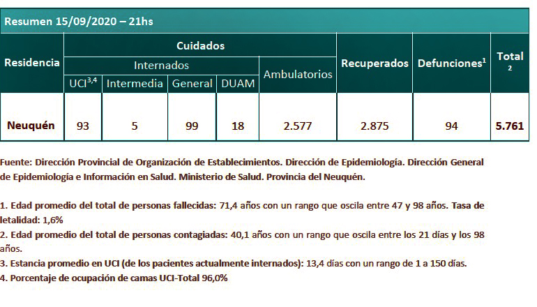 Respecto a los decesos, informaron que "se trata de un varón de 59 años, de Centenario; una mujer de 83 años, de San Patricio del Chañar, con comorbilidades (enfermedad neurológica crónica); un varón de 84 años, de Centenario, sin comorbilidades; un varón de 78 años, de Centenario, con comorbilidades (diabetes e hipertensión arterial); una mujer de 67 años, de Neuquén capital, con comorbilidades (diabetes, insuficiencia renal, hipertensión arterial, vasculopatía periférica); un varón de 53 años, de Centenario, sin comorbilidades; una mujer de 59 años, de Centenario, con comorbilidades (diabetes y obesidad); y un varón de 65 años, de Neuquén capital, con comorbilidades (hipertensión arterial, diabetes e insuficiencia renal)".