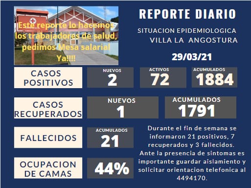 El registro corresponde al fin de semana y este lunes. La curva de contagios sigue aumentando, aunque en forma lenta. Los casos activos son 72 al día de hoy, lunes 29 de marzo.