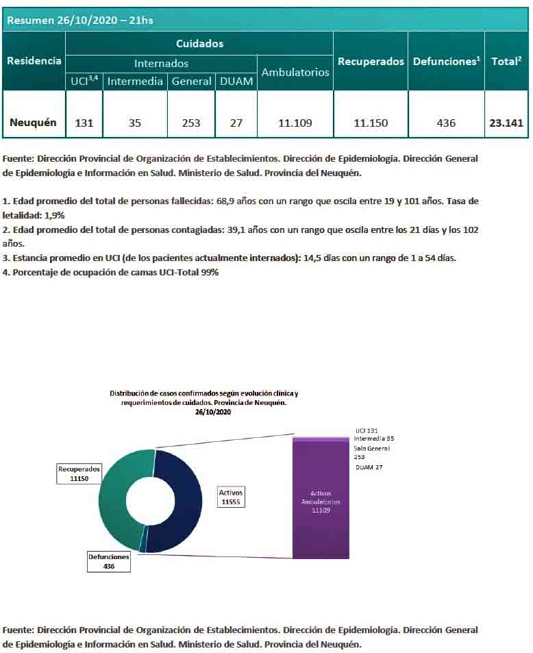 Además, se reportaron quinientas once (511) nuevas personas recuperadas de Coronavirus (COVID-19) de la provincia del Neuquén: 275 personas de Neuquén capital, 146 personas de Plottier, 25 personas de Zapala, 19 personas de Cutral Co, 13 personas de Centenario, 11 personas de Rincón de los Sauces, 11 personas de Las Lajas, 2 personas de Bajada del Agrio, 2 personas de Picún Leufú, 2 personas de Senillosa, 1 persona de Huinganco, 1 persona de Los Miches, 1 persona de Chos Malal, 1 persona de Añelo y 1 persona de Plaza Huincul. Se trata de 267 mujeres y 244 varones, cuyas edades oscilan entre 4 meses y 97 años.