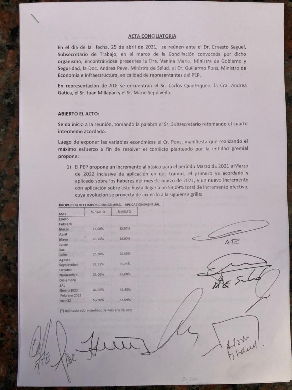 Participaron las ministras de Salud, Andrea Peve, de Gobierno y Seguridad, Vanina Merlo; el ministro de Economía, Guillermo Pons y el subsecretario de Trabajo, Ernesto Seguel. Por ATE lo hicieron, Carlos Quintriqueo, Juan Millapán, Andrea Gatica y Mario Sepúlveda.