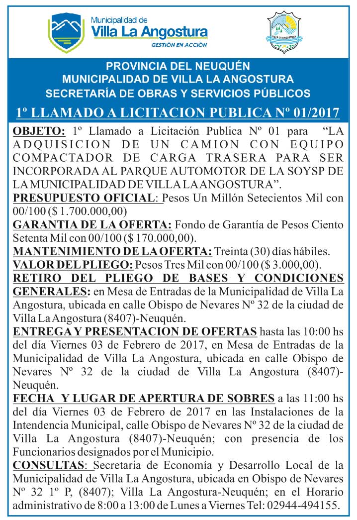 La Municipalidad de Villa la Angostura llama a licitación pública 01/2017 para la compra de un camión con equipo compactador de carga trasera