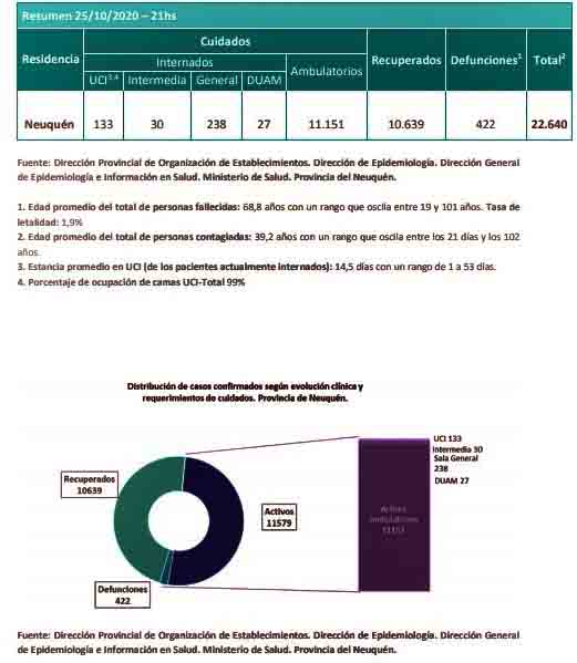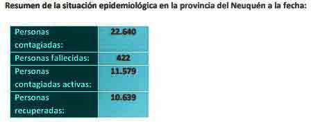 Por otra parte,  se informó el fallecimiento de 18 personas de la provincia del Neuquén por Coronavirus (COVID-19): 9 personas de Neuquén, 3 personas de Plottier, 1 persona de Cutral, 1 persona de Plaza Huincul, 1 persona de Rincón de los Sauces, 1 persona de Vista Alegre, 1 persona de Senillosa y 1 persona de Bajada del Agrio. Se trata de 4 mujeres y 14 varones, cuyas edades oscilan entre 40 y 92 años.