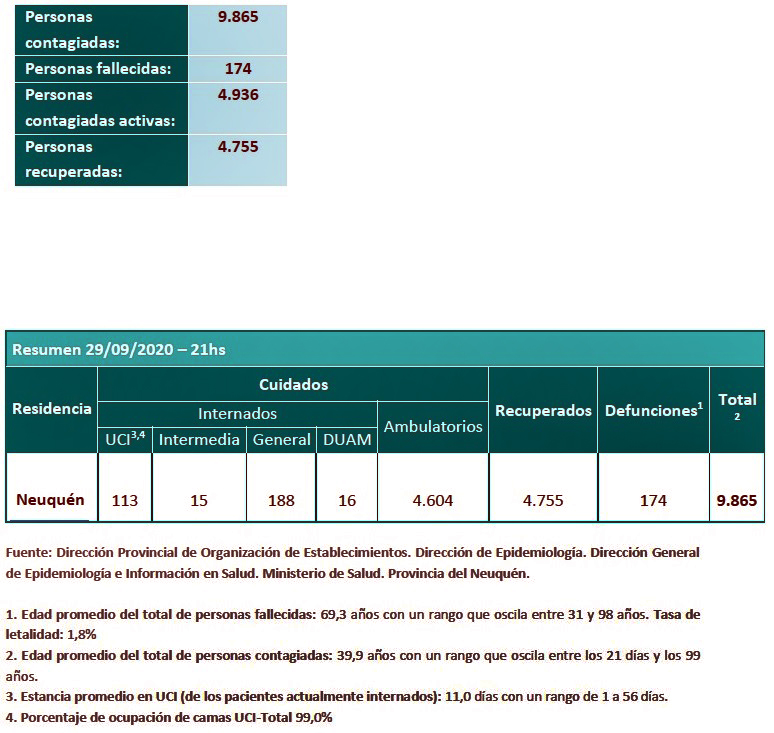 Respecto a los decesos, informaron: "Se trata de un varón de 76 años, de Plaza Huincul, con comorbilidades (hipertensión arterial); una mujer de 85 años, de Neuquén capital, con comorbilidades (hipertensión arterial e inmunosupresión); una mujer de 70 años, de Cutral Co, con comorbilidades (insuficiencia renal crónica); una mujer de 64 años, de Senillosa, con comorbilidades (hipertensión arterial, obesidad mórbida y tabaquismo); una mujer de 83 años, de Centenario, sin comorbilidades informadas; una mujer de 78 años, de San Patricio del Chañar, con comorbilidades (diabetes y obesidad mórbida); un varón de 80 años, de Senillosa, con comorbilidades (hipertensión arterial, fibrilación auricular crónica e insuficiencia cardíaca congestiva); una mujer de 74 años, de Neuquén capital, con comorbilidades (insuficiencia renal crónica, hipertensión arterial, artrosis y demencia); un varón de 81 años, de Neuquén capital, con comorbilidades (hipertensión arterial, diabetes, insuficiencia cardíaca congestiva y obesidad mórbida); una mujer de 55 años, de Plaza Huincul, con comorbilidades (diabetes, obesidad e hipertensión arterial); y un varón de 65 años, de Neuquén capital, con comorbilidades (hipertensión arterial, diabetes y sobrepeso)".