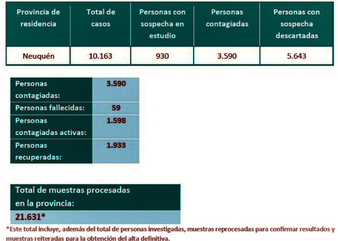 El ministerio de Salud de la Provincia reportó este jueves en la noche 66 nuevos casos de coronavirus, que se suman a los 50 contagios del mediodía. De esta manera, ya son 3.590 los contagios desde el inicio de la pandemia en Neuquén. Además, las autoridades dieron a conocer tres decesos, entre ellos el que se había revelado durante el día de un reconocido vecino de Las Ovejas.