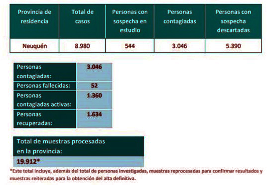 Según el reporte, 41 de los nuevos contagios se detectaron en el conglomerado de Neuquén (33), Centenario (cinco) y Plottier (tres). Respecto a la comarca petrolera se registraron tres casos en Cutral Co y tres en Plaza Huincul.
