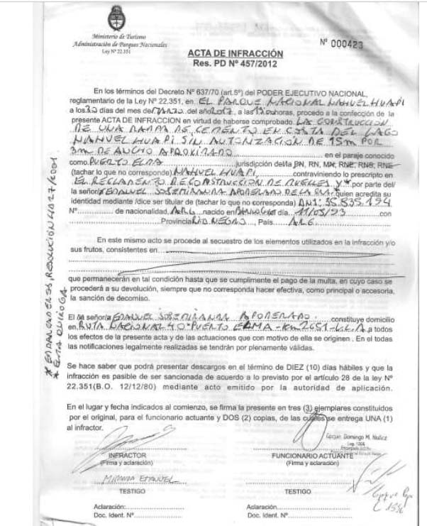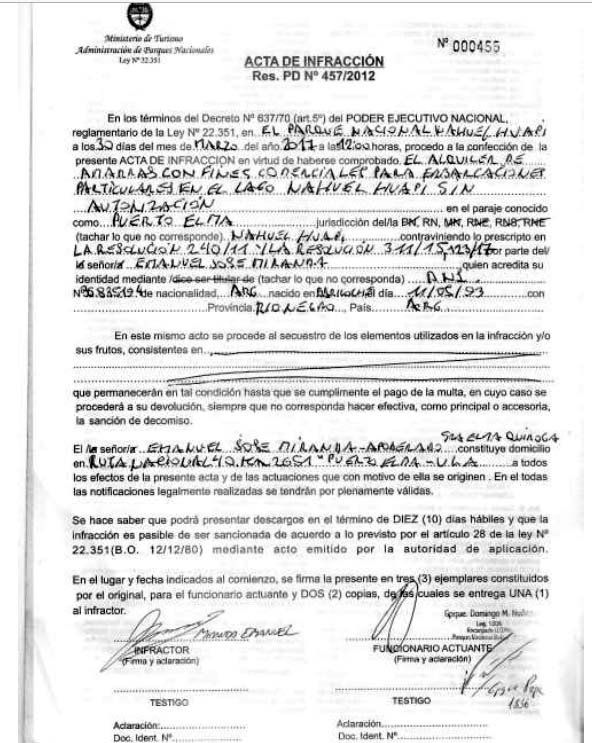 Copia de las actas de infracción labradas por Parques Nacionales, en las que quedan registradas las actividades comerciales ilegales.