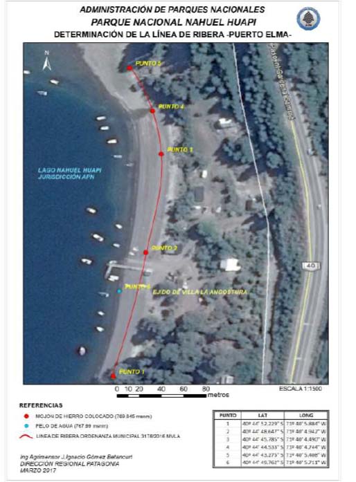 Copia del informe Técnico realizado por el Ingeniero Agrimensor J. Ignacio Gomez Betancurt, que deja en claro las jurisdicciones correspondientes a Parques Nacionales y al Ejido del Municipio de Villa La Angostura, el que pese a nuestras denuncias nunca procedió a evitar la continuidad de un comercio ilegal poniendo en riesgo a turistas y locales por la falta de cumplimiento de las normativas vigentes.