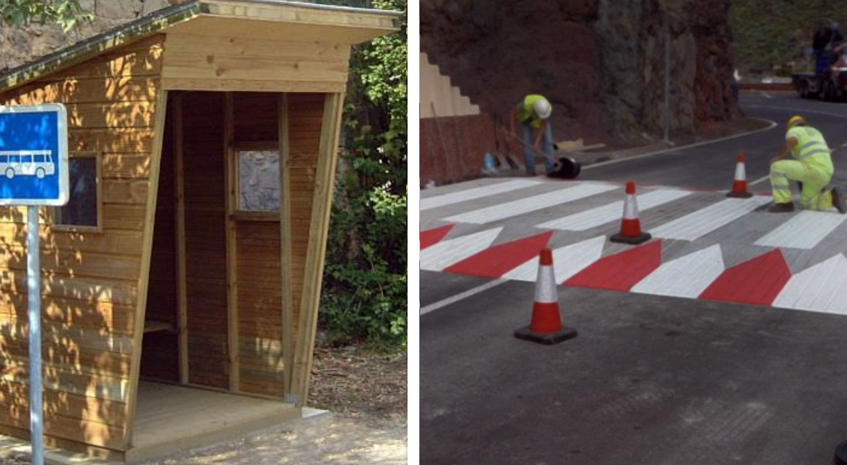 En este caso, el peatón que utiliza el transporte público. Entre Bahía Manzano y hasta más allá del Correntoso, montemos refugios de madera (hechos por artesanos locales) cada 200 m., con dársenas para detención del bus y sendas peatonales elevadas sobre la ruta a modo de reductores de velocidad, también desmontables para poder variar su ubicación en caso de necesidad.