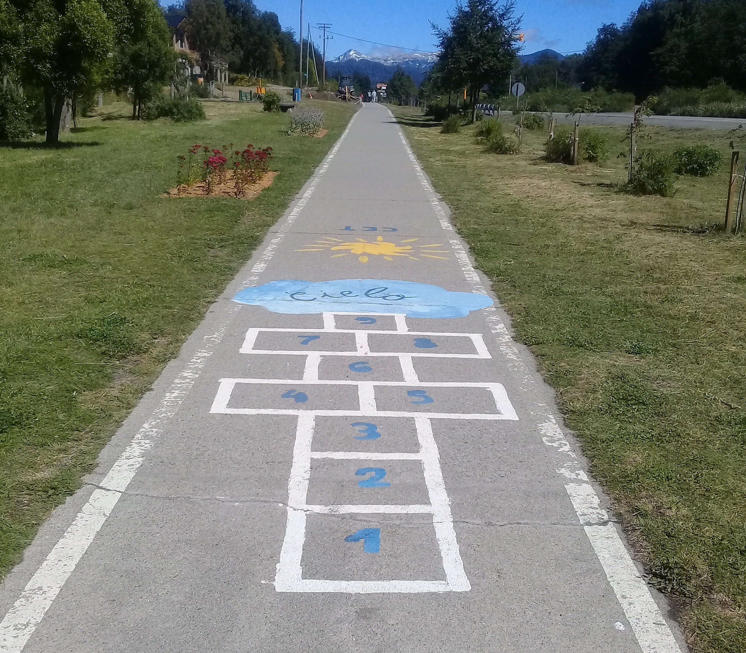 Hoy por la mañana salí a caminar por la bicisenda y me encontré con una hermosa sorpresa, juegos pintados en el suelo. Juegos simples, algunos olvidados, que me llevaron a mi infancia y sin dudar comencé a saltar sobre la rayuela.