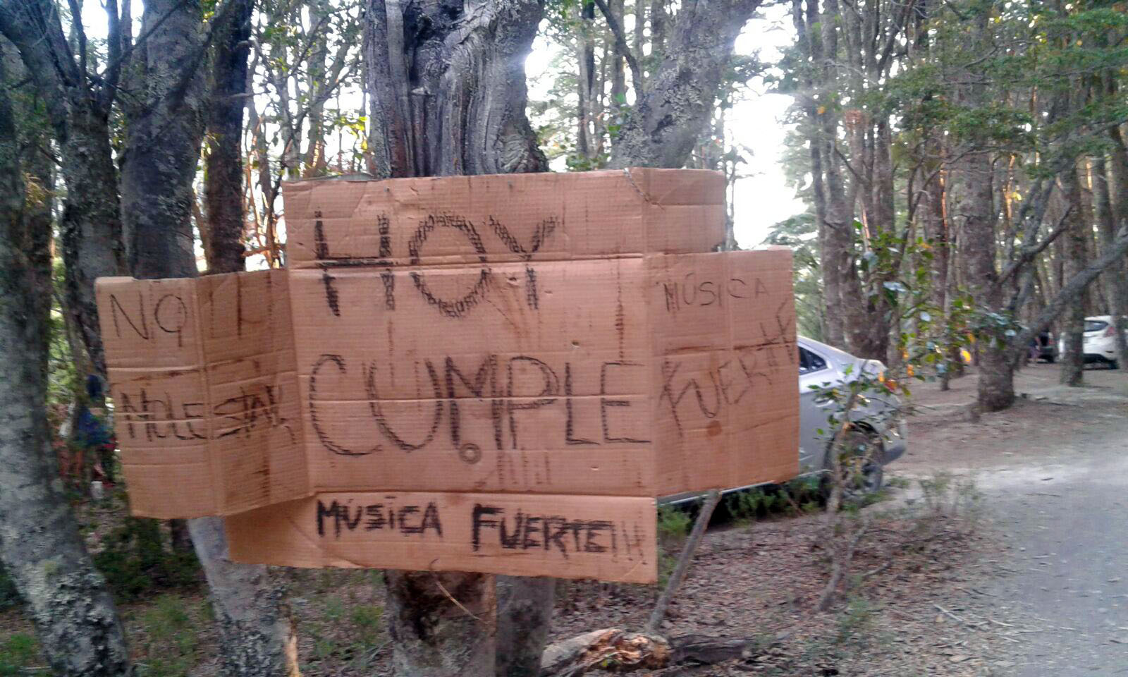 A media tarde, al ir a la proveeduría, al pasar junto al campamento de nuestros ocasionales vecinos, nos encontramos con este cartelito que adjuntamos: "HOY CUMPLE: MÚSICA FUERTE, NO MOLESTAR". Preguntado el señor de proveeduría si había alguna restricción de ruidos molestos, respondió que la música estaba permitida sólo hasta la medianoche.