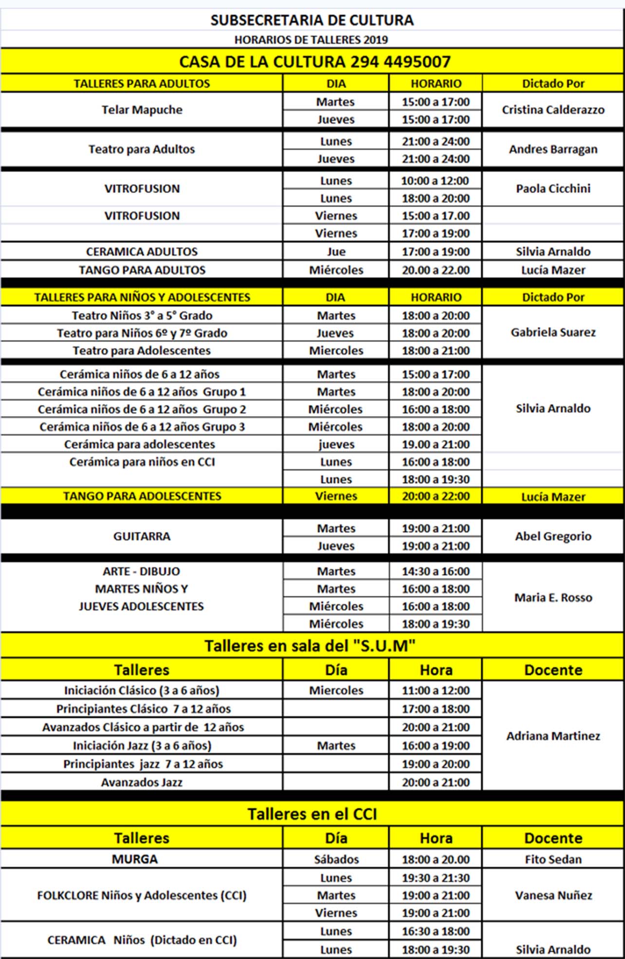 Compartimos los horarios de los talleres que ofrece este año la Casa de la Cultura. Los talleres comenzarán el próximo lunes 18 de marzo. Los interesados deberán inscribirse con el profesor del taller elegido en el mismo horario de clases.