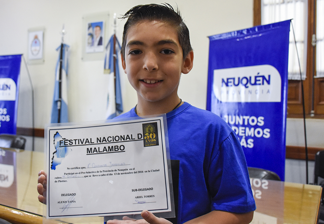El bailarín Jeremías Contreras, de 9 años, representará a la provincia del Neuquén en el Festival Internacional de Malambo de Laborde, que se desarrollará en esa localidad cordobesa del 8 al 14 de enero. Esta mañana recibió de parte del gobierno provincial el respaldo para viajar junto a su familia y concretar su participación.