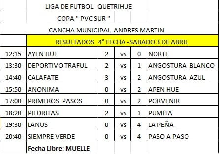 El pasado sábado se llevó a cabo una nueva fecha del torneo de fútbol libre que organiza la Liga Quetrihue. Con los resultados y la fecha libre que tuvo Muelle, el equipo de Paso a Paso quedó como único líder del campeonato que tiene en juego la Copa "PVC Sur".