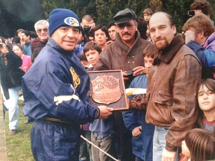 La visita a Villa la Angostura fue en 1997, en el marco de la última pretemporada de Diego Maradona en el fútbol, ya que ese año se retiró en Boca en un clásico con River. Resulta que parte de los trabajos los realizó en nuestra localidad, dado que aquí residía su amigo Carlos Randazzo, ex compañero en el xeneize.