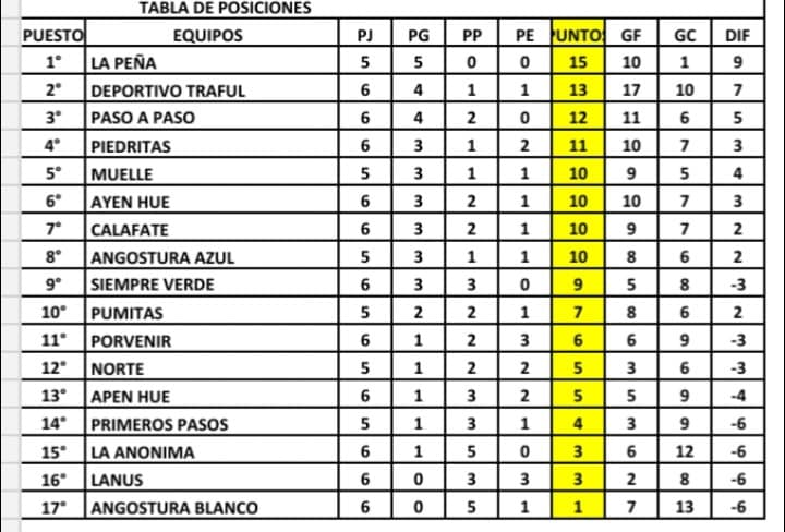 Deportivo Traful sumó de a tres (13) y de esa manera se mantiene expectante en la pelea de la cima, mientras que muy cerca se mantiene Piedritas (11) que logró un empate con Lanus (3) en un tanto por lado.