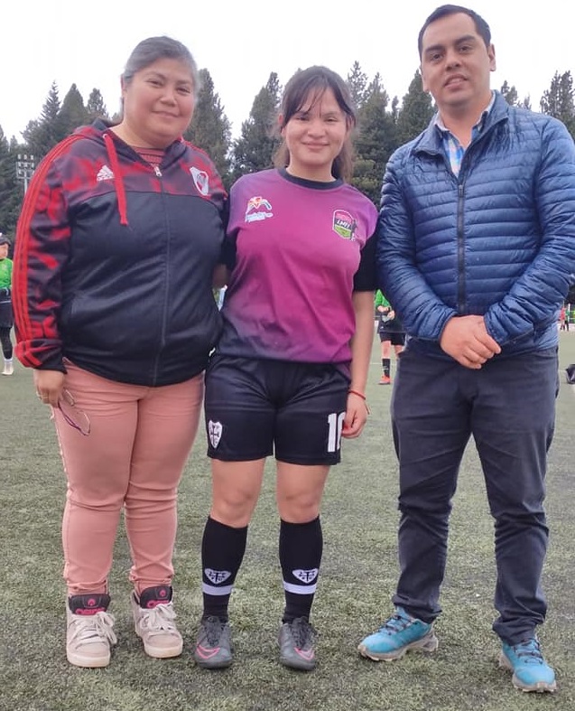 El presidente del Club La Peña, Nicolás Navarro, junto a la Vice Presidenta, Quintupuray Mariela, acompañaron ayer a la jugadora Larisa Vera, a quien eligieron para integrar la selección de la Liga Municipal de Bariloche, donde compite el equipo femenino angosturense, para disputar un partido amistoso contra el preseleccionado de la provincia de Río Negro.