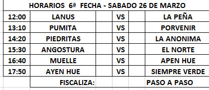 En ese primer partido el Deportivo Angostura y Muelle no se sacaron diferencias y dividieron los puntos al empatar 2 a 2 al cabo del tiempo reglamentario. Pumitas demostró que este año está para más y derrotó por 3 a 0 a Apen Hue, mientras que Ayen Hue goleó a Norte por 6 a 2.