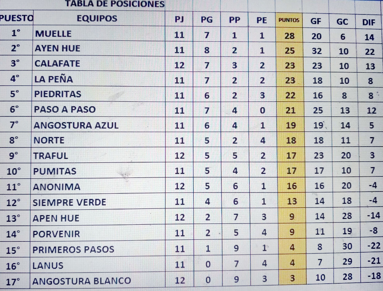 Y es que Muelle (28 puntos) derrotó a Calafate (23) por 1 a 0 y de esta manera se mantiene como único líder, mientras que Ayen Hue goleó 3 a 0 a Lanus (4) y quedó segundo, a tres puntos del puntero.