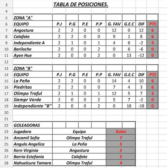 Por la Zona A son el Deportivo Angostura y Calafate quienes lideran con puntaje ideal, mientras que en la Zona B son La Peña y el Club Las Piedritas quienes también ganaron sus dos partidos y están invictos los dos equipos.