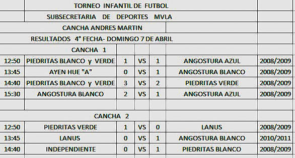Resultados de una nueva fecha del Torneo de Fútbol Infantil que se llevó a cabo el pasado domingo en la cancha Andrés Martin, organizado por la Subsecretaría de Deportes y Juventud municipal.