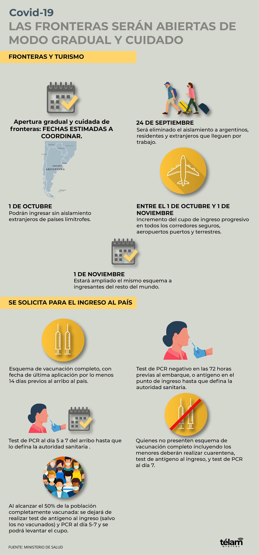 - 24 de septiembre: eliminación del aislamiento a argentinos, residentes y extranjeros que vengan por trabajo y estén autorizados por la autoridad migratoria.