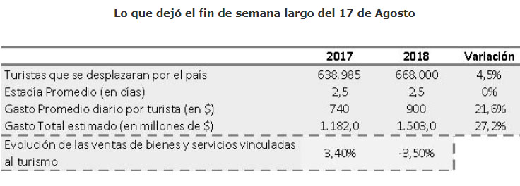 Entre el viernes 17 y el lunes 20 de agosto se desplazaron 668.000 personas por el país, un 4,5% más que en el mismo feriado del año pasado. Sin embargo, las ventas minoristas vinculadas al sector descendieron, en parte, porque el consumo se repartió también entre el Día del Niño y los viajes.