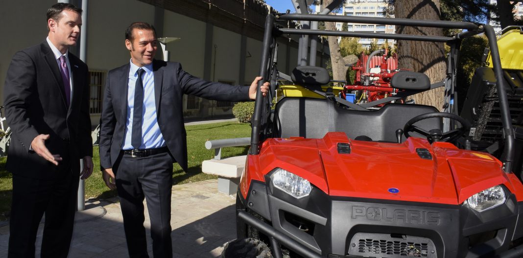 El vehículo donado para la lucha contra incendios es un utilitario Polaris 6×6, con un motor de 760 centímetros cúbicos y doble tracción. Está provisto con un tanque de 300 a 450 litros de agua y otro de casi 20 litros para espuma co-polímero. Puede transportar 900 kilos de carga y remolcar un peso similar.