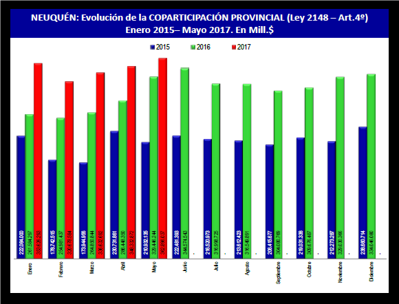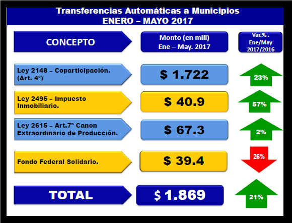 El gobierno de la provincia del Neuquén transfirió a los municipios, de forma directa y automática, 1.869 millones de pesos. Las transferencias mensuales durante los primeros cinco meses de 2017 reflejaron un aumento del 21% comparado con igual período de 2016. En cifras, el incremento representa más de 327 millones de pesos. Las transferencias son directas, automáticas y de envío habitual, y siempre han sido la principal fuente de financiamiento de los gastos municipales.