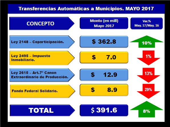 En el mes de mayo, el total de las transferencias automáticas a los municipios alcanzó los 391 millones de pesos, un 8% por arriba de lo enviado en el mismo mes del año anterior. Los incrementos que se registraron en la coparticipación federal (+ 34%) y en los tributos provinciales (+9%) fueron levemente superiores a los descensos en regalías, impuesto inmobiliario adicional, canon extraordinario de producción y fondo federal solidario.