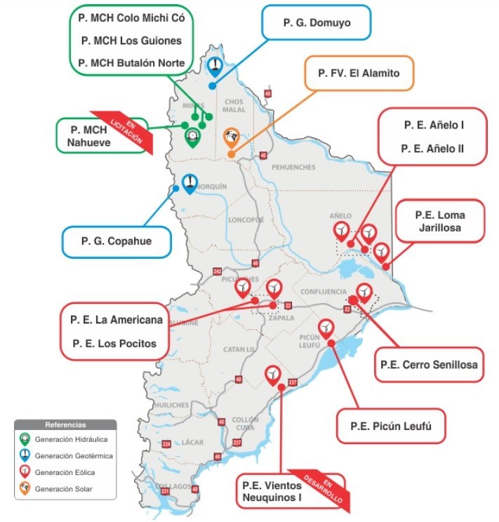 El Gobierno provincial ha desarrollado emprendimientos eólicos, hidroeléctricos, geotérmicos y fotovoltaicos que espera construir durante el año que viene. En estos momentos, hay entusiasmo por el montaje del parque eólico Vientos Neuquinos, que será el más importante de la provincia argentina.