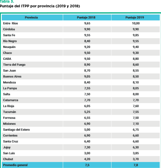La provincia de Neuquén obtuvo en 2019 un puntaje de 9,40, superando los 9,20 puntos del año anterior. De esta manera se ubicó en el quinto lugar, detrás de Entre Ríos (10), Córdoba (9,90), Santa Fe (9,85) y Río Negro (9,55). El promedio de todas las jurisdicciones fue de 7,8 puntos, mientras que en 2018 había sido de 7,5 puntos.