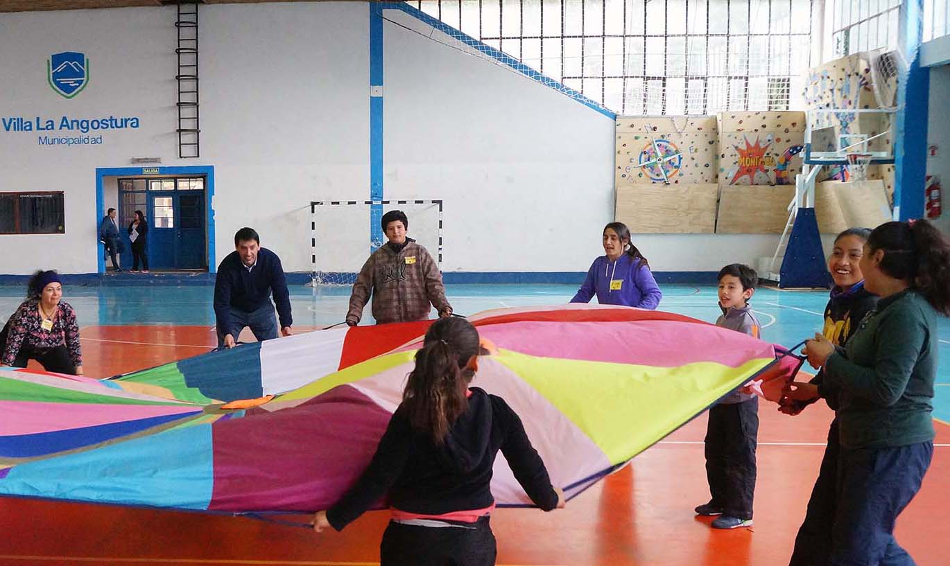 En la previa del día de esquí este grupo de profesionales realizó en el gimnasio Enrique Barbagelata una actividad de integración con los alumnos de la Escuela 303 de Isla Victoria con el objetivo de capacitar a los niños acerca de la prevención sobre sus derechos.