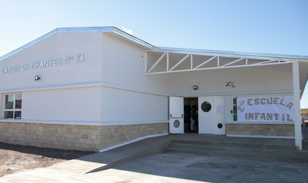 Para el nuevo Jardín de Infantes Nº 74 de Villa El Chocón se construyeron tres salas con sanitarios, dependencias, hall de acceso, circulación, área administrativa (dirección, secretaría, sala de docentes, sanitarios para docentes), SUM, área de servicio (cocina, depósitos de comestibles, de limpieza y de Educación Física), sanitarios y sala de máquinas.