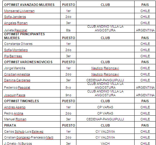 Del Club Andino Villa la Angostura participaron los timoneles: en la categoría Optimist, Julieta Pascolat, Federico Pascolat, Joaquin Fasce, y en la categoría laser Pablo Mascias, y Geronimo Fasce colaboro en la preparación y armado de las embarcaciones.