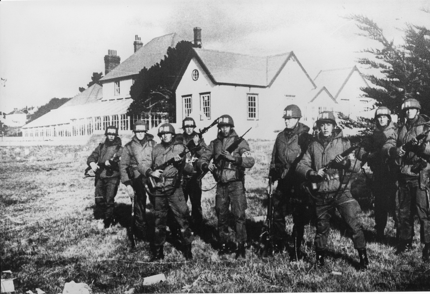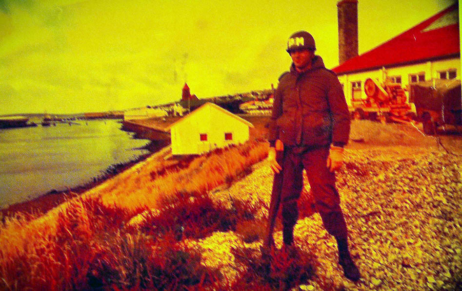 En la foto vemos a Horacio Haag, ex combatiente de Malvinas y actualmente radicado en Villa la Angostura, custodiando la casa del gobernador. Otro veterano es Fernando Fal, a quien le tocó defender las últimas dos semanas el aeropuerto de Puerto Argentino, el Dr. Ricardo Saenz de Luque que tuvo a su cargo curar a los heridos y Daniel Sosa mecánico de helicópteros durante el conflicto.