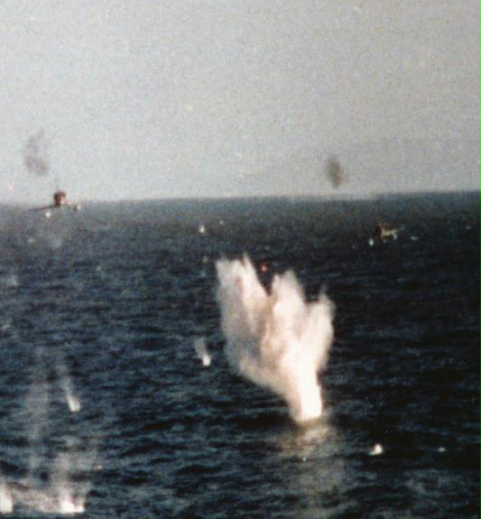 Quizás la mejor foto de Malvinas aquí bastante limpia y digitalizada. Nuestros héroes Carballo y Rinke con sus A-4 entre los proyectiles británicos atacando al HMS Broadsword.