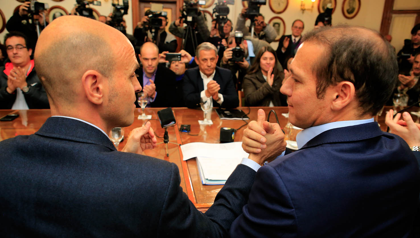 El gobernador Omar Gutiérrez y el ministro de Transporte de la Nación, Guillermo Dietrich firmaron hoy una serie de convenios para la concreción de infraestructura vial en la provincia. El gobierno nacional aportará 4.090 millones de pesos mientras que la provincia invertirá 856 millones de pesos. El acto, del cual participaron autoridades provinciales, nacionales y varios intendentes, se realizó este mediodía en el Salón de Acuerdos de Casa de Gobierno.