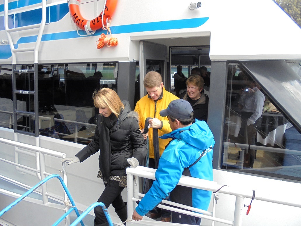 El viaje, desde Puerto Pañuelo al muelle ”Modesta Victoria”, en la zona histórica de Villa La Angostura, se organizó para un grupo de viajeros con itinerario diferenciado. El perfil del catamarán recortado sobre el muelle sorprendió a los turistas y a los lugareños por sus dimensiones.