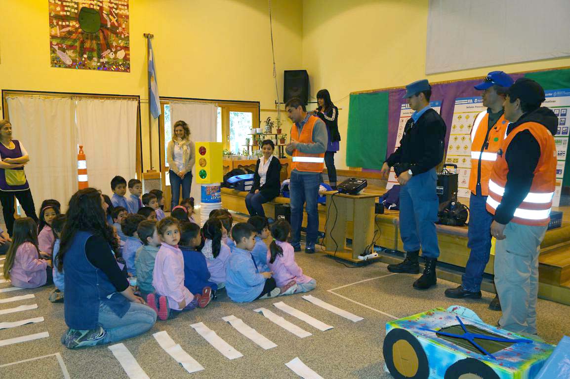 Por la mañana, fue el turno del jardín 57 Hueni Hue donde personal de la secretaría de seguridad, tránsito y un efectivo de la comisaría 28 de Villa La Angostura, les mostraron a los niños las distintas dificultades con las que deben estar prevenidos en materia de tránsito.