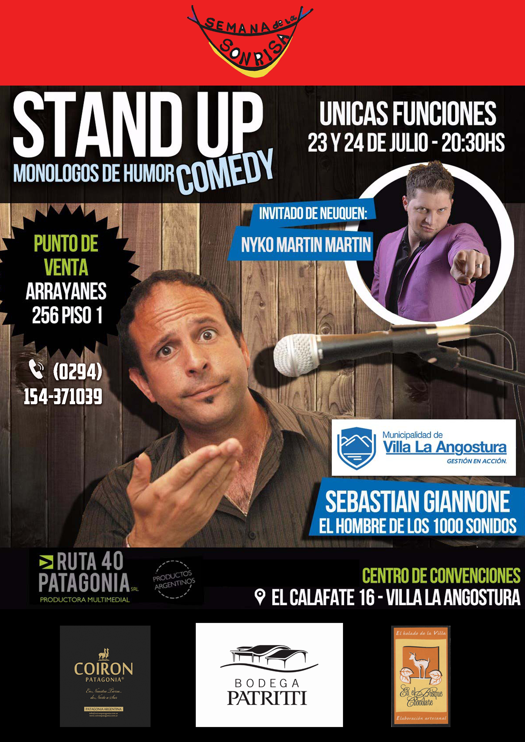 Villa la Angostura sigue sonriendo, en “ la semana de la sonrisa" , se presenta el próximo sábado 23 y domingo 24 de Julio en el Centro de Convenciones  ¡un espectáculo para reír!El  Stand Up  en esta oportunidad de  la mano de “el hombre de los mil sonidos”, Sebastián Giannone.
