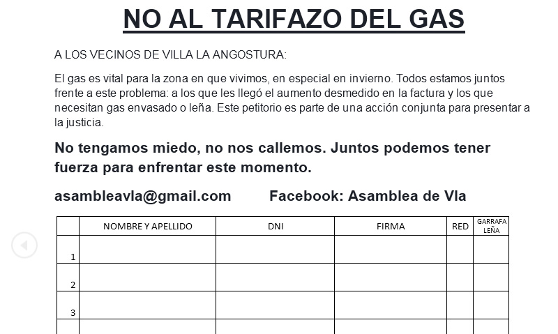 El martes 17 de mayo de 2016, la Asamblea Ciudadana de Villa La Angostura decidió juntar firmas para ser presentadas ante las autoridades y en acciones judiciales, en contra del TARIFAZO DEL GAS.