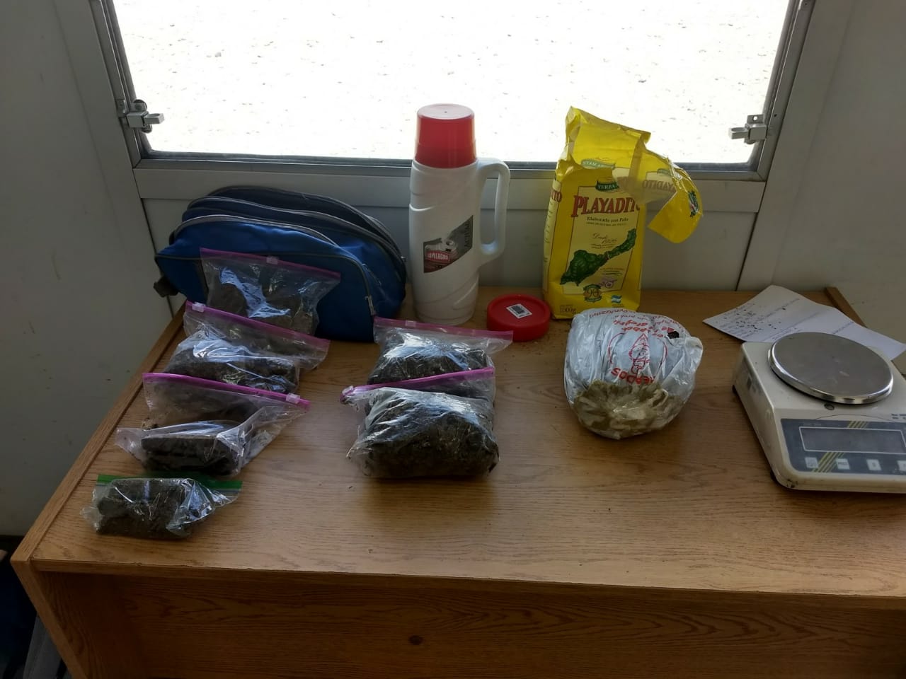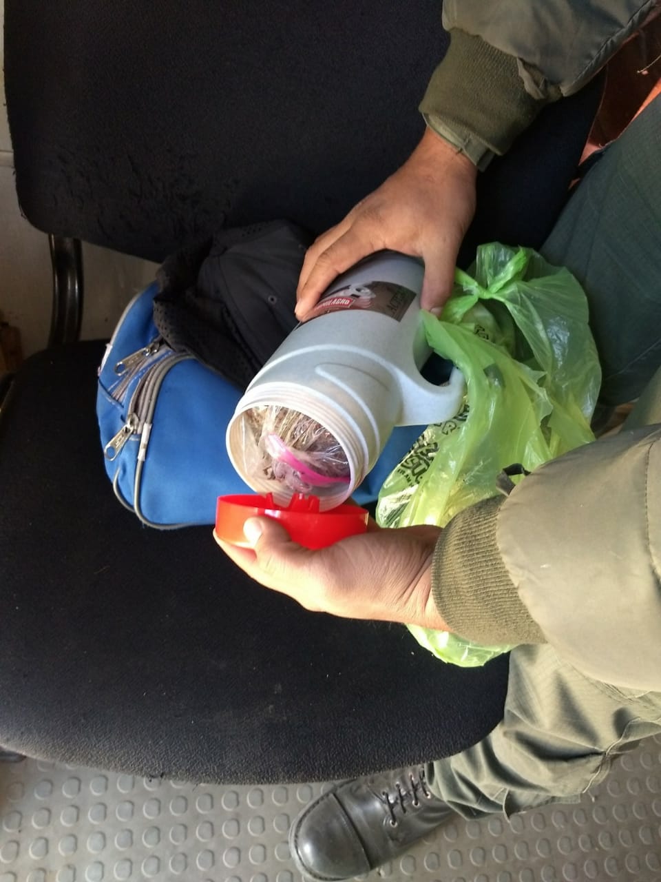 En una requisa de Gendamería, llamó la atención el peso del termo. Al abrirlo, encontraron paquetes con marihuana. Además se encontró un bolso con otros dos kilos de marihuana.