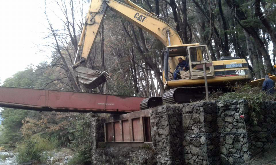El puente, de estribos de gaviones, estructura metálica y tablero de madera, cedió frente al peso de un camión de la empresa Codi SA que se encontraba trabajando en la obra de pavimentación de la travesía urbana de Villa Traful.