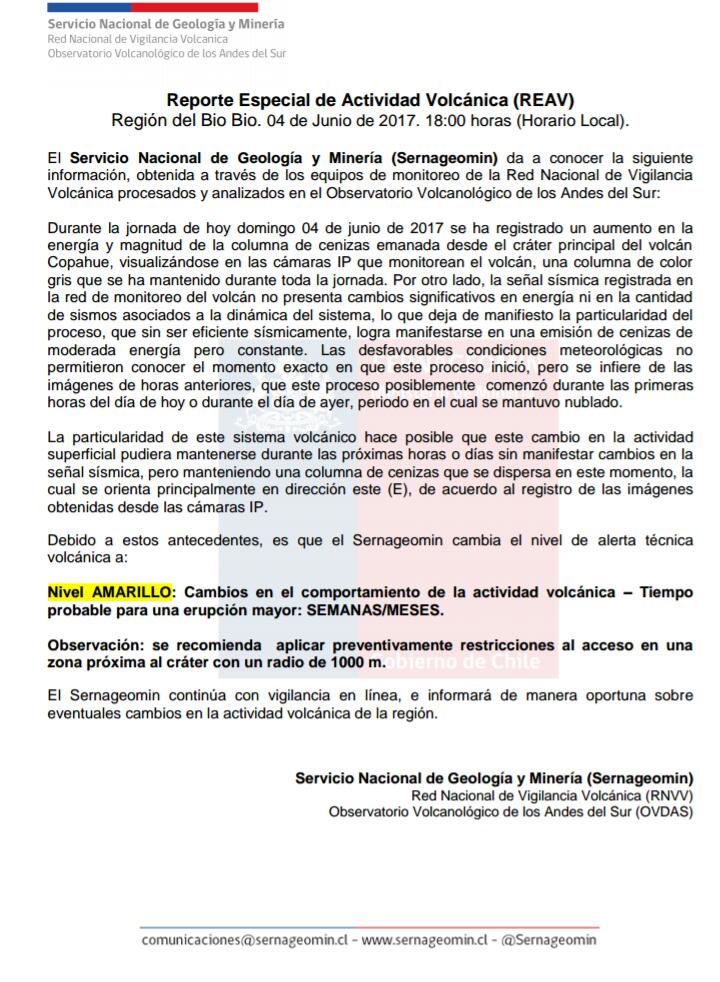Esto hace posible que este cambio en la actividad superficial pueda mantenerse durante las próximas horas o días, manteniendo una columna de cenizas que se dispersa en dirección Este. Debido a estos antecedentes, es que el Sernageomin cambia el nivel de alerta técnica volcánica a amarillo porque presenta cambios en el comportamiento de la actividad volcánica.