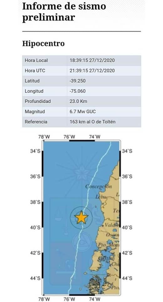 Un sismo calificado por los organismos de emergencia como de mediana intensidad se registró hace pocos minutos afectando directamente a las regiones de Biobío, La Araucanía, Los Ríos y Los Lagos, con una intensidad estimada de 6,7 grados Richter e intensidades variables de V a VI grados en la escala de Mercalli.
