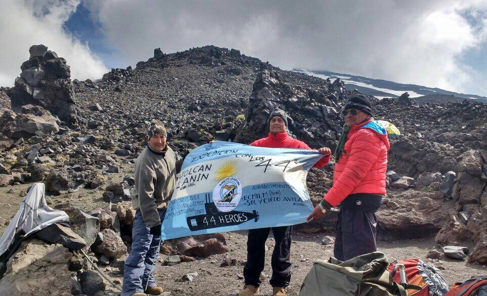 Tres militares retirados llevaron una bandera con los nombres de los 44 marinos a lo más alto del volcán para rendirles homenaje.