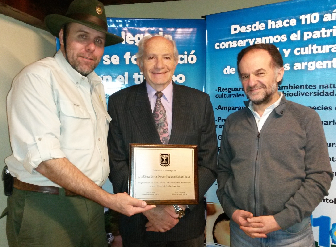 La placa fue entregada en agradecimiento a la colaboración y destacada atención que ofrecen los Parques Nacionales de Patagonia y el Parque Nacional Nahuel Huapi, al turismo del Estado de Israel en Argentina.