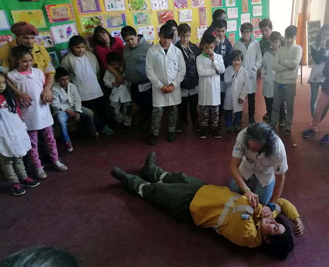 Unas 70 personas, en su mayoría alumnos de la escuela primaria, docentes, auxiliares y personal de Protección Civil de Traful y de Incendios Forestales, aprendieron estas prácticas fundamentales para actuar como primeros respondientes en casos de muerte súbita.