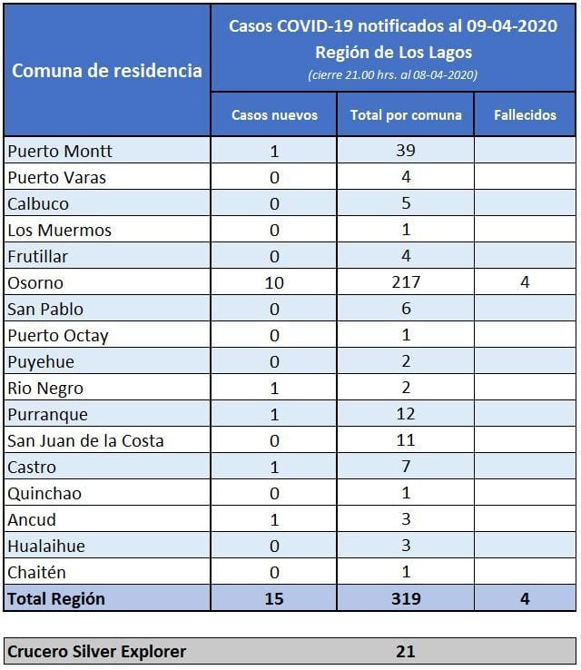 Se informó que durante la madrugada de este jueves 09 de abril en la región de Los Lagos, se produjo el cuarto deceso por Covid-19, que corresponde a una persona de sexo masculino de 62 años de edad con patologías de base, que se encontraba internado en el Hospital Base de Osorno, detalló la autoridad.